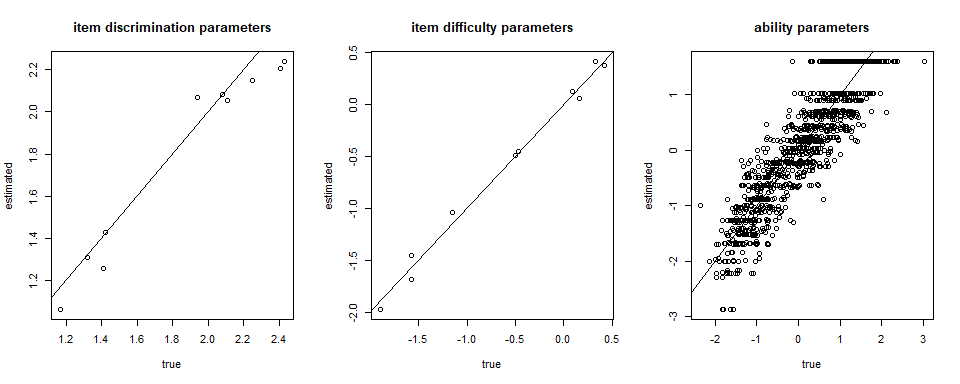 plot(theta, fscores$theta, xlab = "true", ylab = "estimated", main = "ability parameters")