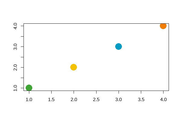 plot(1:4, 1:4, col=1:4, pch=19, cex=3, xlab="", ylab="")