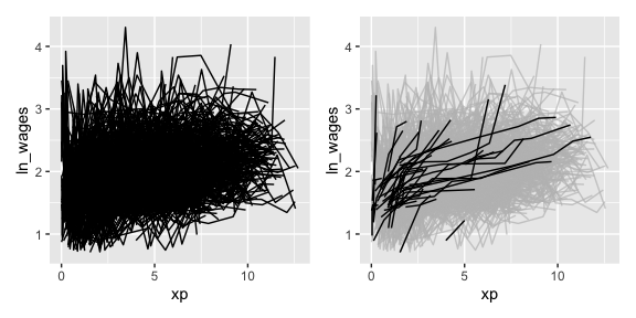 The wages data is an example dataset provided with brolgar. It looks like this: