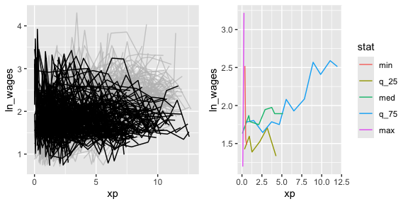 For example, if you want to answer the question “What is the summary of wages for each individual?”. You can use features() to find the five number summary (min, max, q1, q3, and median) of ln_wages with feat_five_num: