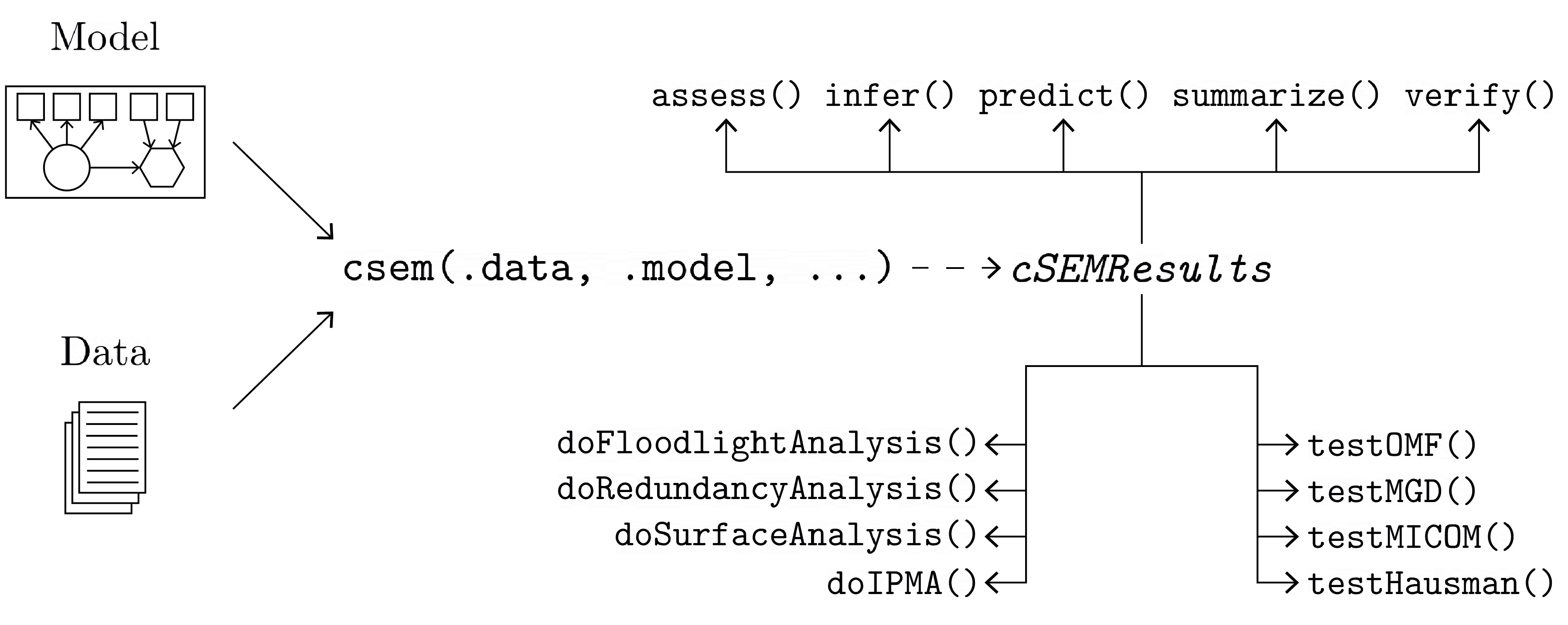 Estimate, analyse, test, and study linear, nonlinear, hierarchical and multi-group structural equation models using composite-based approaches and procedures, including estimation techniques such as partial least squares path modeling (PLS-PM) and its derivatives (PLSc, OrdPLSc, robustPLSc), generalized structured component analysis (GSCA), generalized structured component analysis with uniqueness terms (GSCAm), generalized canonical correlation analysis (GCCA), principal component analysis (PCA), factor score regression (FSR) using sum score, regression or Bartlett scores (including bias correction using Croon’s approach), as well as several tests and typical post-estimation procedures (e.g., verify admissibility of the estimates, assess the model fit, test the model fit, compute confidence intervals, compare groups, etc.).