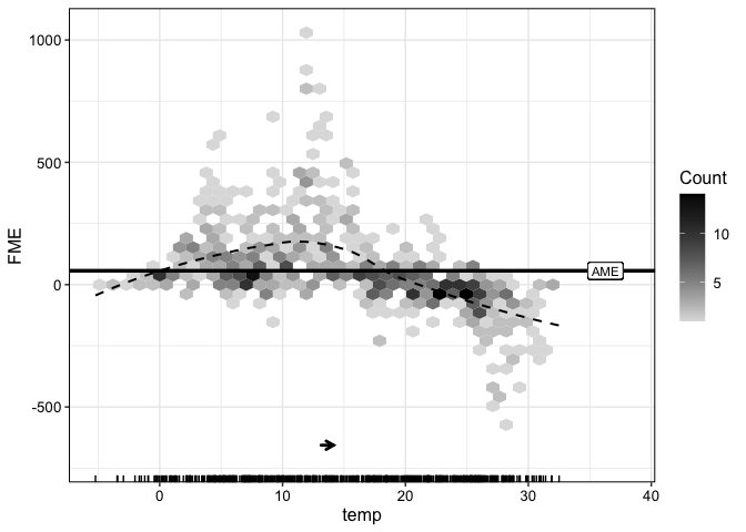 See here for an in-depth tutorial. The big advantage of FMEs is that they are interpreted similar to beta coefficients in linear regression models. Consider the following example: how does an increase in temperature (temp) by 1°C affect bike rentals (count)?