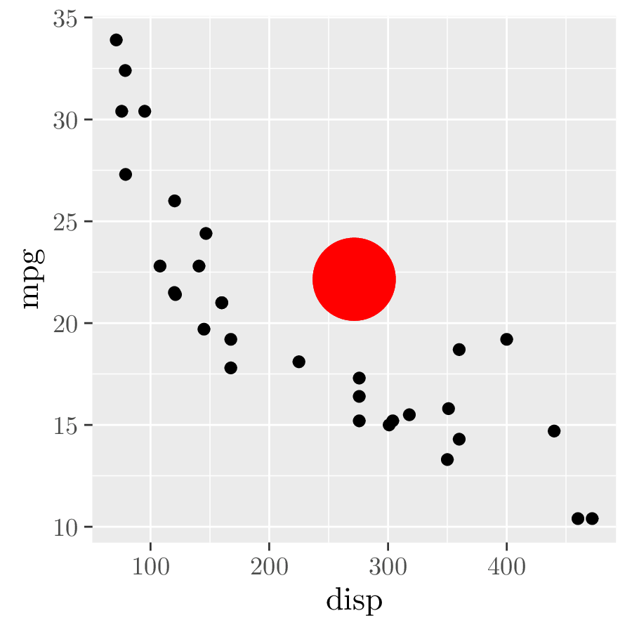 p <- ggplot(mtcars, aes(disp, mpg)) + geom_point() # 1.