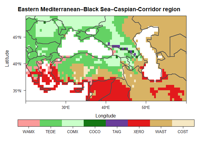 devtools::install_github("szelepcsenyi/macroBiome")Create a biome map of the Eastern Mediterranean–Black Sea–Caspian-Corridor region for the period 1991-2020 using the CRU TS v.4.05 dataset (Harris et al. 2020)