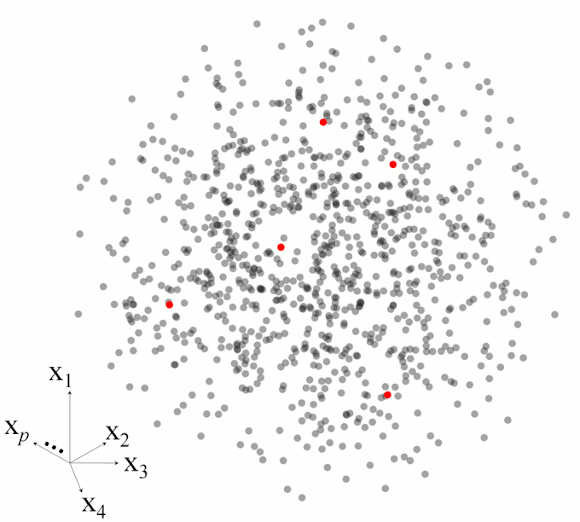 Figure 2. Example of the main steps in memory-based learning for predicting a response variable in five different observations based on set of p-dimesnional variables.