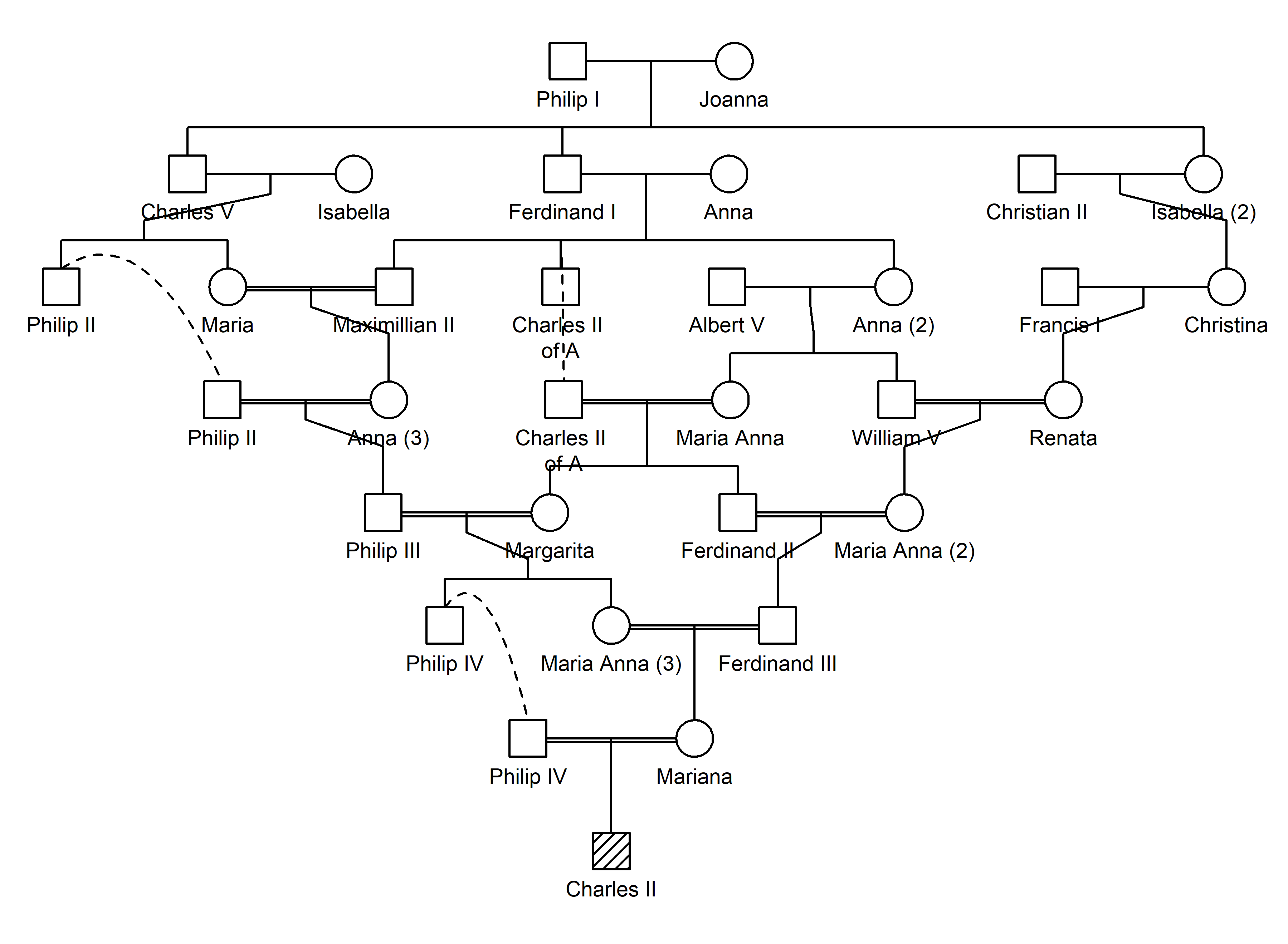#> Philip IV-Philip III-Philip II-Charles V-[Philip I,Joanna]-Isabella (2)-Christina-Renata-Maria Anna (2)-Ferdinand III-Mariana